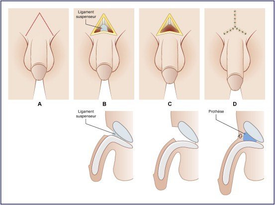 - Un allongement du pénis par une plastie, en "Y" inversé, ou en "Z".